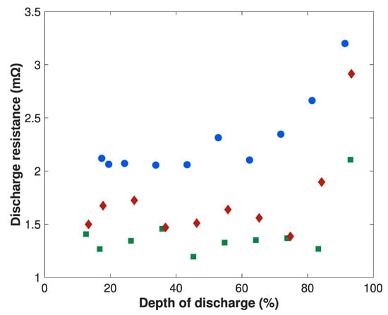 Discharge resistance of a second life cell at 0 (blue points), 25 (green squares) and 40 °C (red diamonds). Measurement is made at −1C and a 5 s resistance is considered.
