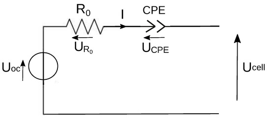 The first one is shown in Figure 6 and will be named “ model”. It consists of an open circuit voltage () source in series with two elements: a resistance which models the ohmic behavior and a Constant Phase Element () associated with the other dynamic behavior.