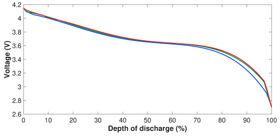 The parameters , , , Q and are intended to emulate the dynamic behavior of a mobile charging station. To model the influence of the depth of discharge on these parameters, 10 experimental points were considered, ranging from a depth of discharge of 10% to 90% and at a current rate of −1C. The equations used to model the influence of the depth of discharge on these parameters are presented in Appendix A and the values of models parameters are available in Appendix B.
