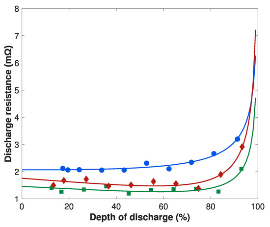 The resistance models the ohmic drop, it is determined first as it is the shortest dynamic phenomenon that will be modeled in this study. The influence of discharge depth and temperature on the resistance was determined experimentally in step 2 of the characterization test shown in Figure 3. To model the influence of discharge depth on , 10 experimental points were considered from discharge depth 10% to 90% and at a current rate of −1C. A logarithmic interpolation is considered between two experimental points for intermediate levels of discharge depth. The influence of the depth of discharge on the 0 s resistance is modeled according to Equation (A6). The result of the resistance interpolation is shown in Figure 9.