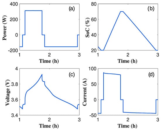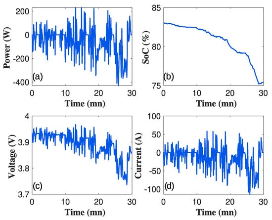 (a) Power, (b) state of charge, (c) voltage and (d) current evolution during a Worldwide Harmonized Light Vehicles Test Cycle profile.