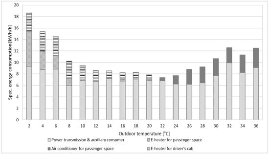 The collection of measurement data regarding the specific energy consumption by the HVAC systems of battery-driven electrical buses leads to the following conclusions: The individually adjustable temperature in the driver’s cab (in contrast to the automatic climate control in the passenger space) has a very large effect on the overall specific energy consumption of the HVAC systems. In the temperature range between 2 and 10 °C, its proportion for the airport transport buses amounted to between 35% and 88%. The consumption by the e-heater for the driver’s cab in the city bus had the highest values in the temperature range between 12 and 18 °C. Its proportion of the overall specific energy consumption amounted to 81.7%, and this had to be improved because direct electric heating is less efficient than the use of a heat pump, which was also installed.