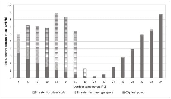 The lowest specific energy consumption was in the temperature range between 20 and 22 °C. This was due to the desired temperature of 22 °C in the passenger space. In this range, the heat pump was mainly operated for ventilation purposes.