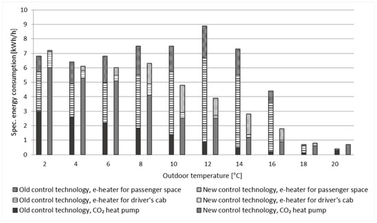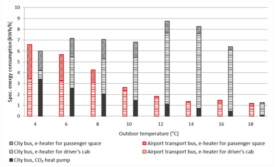 Figure 3 shows the variation in the specific energy consumption values between the airport transport bus and the city bus in the temperature range between 4 and 18 °C. Between 10 and 18 °C, in the airport transport bus, only the driver’s cab was heated because the temperature in the passenger compartment is then higher than the stored minimum target value of 10 °C. In this range, the specific energy consumption by the city bus was significantly higher than that of the airport transport bus. This is due to the higher desired temperature in the passenger space of the city bus, which is about 22 °C (see above). Accordingly, in the range between 10 and 18 °C, in the city bus, both the passenger space and the driver’s cab are heated using the e-heater and the CO2 heat pump. An additional, but less important, cause of the increased specific energy consumption by the city bus could be the fact that it opens and closes its doors more frequently than the airport transport bus.