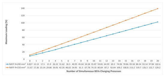 Furthermore, the impact of BEV charging on cables with different cross-sections and similar lengths can also be evaluated from the line loading perspective. A total of 14 simultaneous BEV charging events led to 100.2% loading in the first section of NAYY 4 × 150 mm2 cable, as seen in Figure 5; however, for the same circumstance, the loading of NAYY 4 × 240 mm2 cable was 74.06%. The 240 mm2 cable was overloaded by 102.6% due to 20 simultaneous BEVs charging events, whereas the 150 mm2 cable was subject to an additional 39.2% overloading that could cause the cable to overheat.