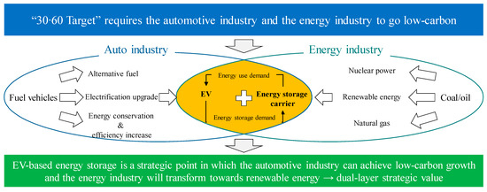 China’s climate goal to reach peak carbon emissions before 2030 and achieve carbon neutrality before 2060 (referred to as the “dual-carbon goal” or “30/60 Target”) has brought severe challenges to all walks of life in China [1,2]. The energy industry bears the brunt of these challenges since it is the largest carbon emitter in China. The key to fulfilling China’s “dual-carbon goal” lies in the low-carbon energy transformation. Considering the safety of nuclear energy and the geographical limitations of hydropower, wind and solar power have become the primary forms of energy investigated in this regard. However, concerns regarding intermittency, uncertainty, transportation, storage, and wind and solar power consumption will hinder their large-scale promotion. Therefore, it is urgent to find a carrier that enables large-scale energy storage and consumption [3]. As one of the country’s pillar industries, China’s automotive industry accounted for more than 10% of the country’s total carbon emissions in 2020. With a continuous increase in consumption, the carbon emissions generated by the automotive industry are also gradually on the rise. Developing new energy vehicles (NEVs) has become an important initiative through which the automotive industry plans to fulfill the “dual-carbon goal,” which is also an established state strategy that will not be changed [4,5]. Driven by policy and market factors, the market penetration rate of NEVs has passed the critical point, showing a trend of large-scale development, especially with respect to electric vehicles [6]. Equipped with high-power batteries, electric vehicles can store and consume energy. From the perspective of electricity demand and energy storage capacity, EV and renewables-based energy storage systems have a very high degree of strategic matching, presenting extensive prospects, as shown in Figure 1. Considering the “dual-carbon goal”, electric-vehicle-based energy storage is of strategic value to energy transitioning and the low-carbon growth of the automotive industry.