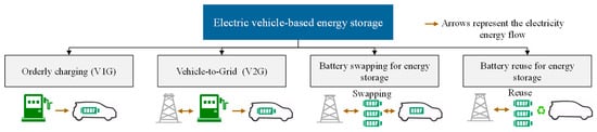 Electric-vehicle-based energy storage refers to the full exploitation of the advantages offered by electric vehicles regarding energy storage and consumption, which can replace fixed energy storage power stations to store unstable energy under the premise of meeting users’ mobility needs. According to the China Energy Storage Alliance (CNESA), EV-based energy storage can be classified into four modes: orderly charging (V1G), vehicle-to-grid interaction (V2G), battery swapping, and the second-life use of decommissioned batteries [7,8] as shown in Figure 2. EV-based energy storage is commonly represented by V2G, whose technologies enable the two-way transmission of energy and information between electric vehicles and smart grids [9]. V2G offers advantages in many fields. Users can recharge their EVs during the off-peak periods when the electricity price is lower and feed electricity back to grids during peak hours when the electricity price is higher, thus generating economic benefits [10]. On the other hand, services such as peak regulation, frequency regulation, reactive power compensation, and spinning reserve can be provided to the power grid via V2G, thus replacing fixed energy storage to provide benefits [8]. With regard to power grids, V2G can reduce the spare capacity of thermal power generation or other conventional units, improve the stability of power grids, and cut investments in spare capacity and equipment renovation, thereby generating economic benefits for grid operators [11,12]. On the surface, V2G is just the interaction between vehicles and power grids, but it requires the participation of players from different fields. A complete V2G ecosystem generally includes three primary roles played by EV users, V2G operators, and power grid operators along with roles filled by secondary players like international standards organizations, governments, energy producers, battery-charging and swapping infrastructure operators, and automobile manufacturers [13]. The primary and secondary players become deeply involved in the operation and cooperate in developing adequate business models to deliver mutually beneficial results. In general, EV-based energy storage offers numerous advantages, whose commercialization will trigger profound changes in the automotive and energy industries.