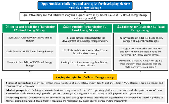 First, we conducted a quantitative analysis of the feasibility of developing EV-based energy storage systems. Second, we elaborated on the strategic opportunities for developing EV-based energy storage systems from the perspectives of policy trends and the characteristics of automotive industry development in China. Third, we analyzed the challenges relating to electric-vehicle-based energy storage from technological, economic, and policy dimensions. Finally, we proposed specific strategies and suggestions for tackling the challenges encountered during the development of electric vehicles in all aspects. These strategies are expected to serve as references for developing the electric-vehicle-based energy storage industry in China.