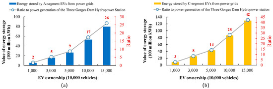 Scale of energy stored by electric vehicles: (a) A-segment scenario; (b) C-segment scenario.