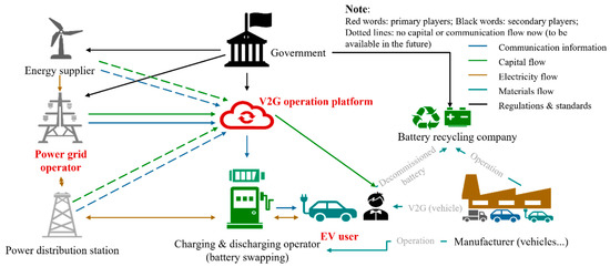 Regarding market development and business models, the EV-based energy storage industry involves multiple sectors and organizations [27]. To realize the coordination and unification of the industry, it is necessary to build a mutually beneficial business ecosystem with the V2G operating platform serving as the core and that incorporates the participation of users, automobile manufacturers, charging station operators, power grids, energy companies, battery-recycling operators, and governments, as shown in Figure 7.