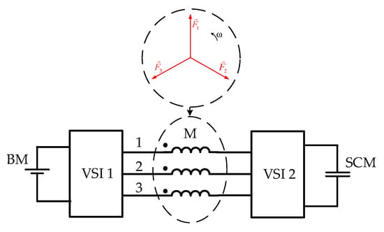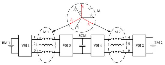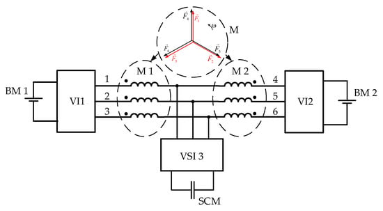 To ensure EV high-speed mode, one of the armature-winding modules must be energized on both sides when the voltages of the corresponding BM and SCM are added. So, if the armature-winding module M 1 is working, it is energized from both sides: from the side of the beginnings of the module winding from the BM 1 through the VSI 1 inverter, and from the side of the ends of the module winding from the SCM through the VSI 3 inverter.