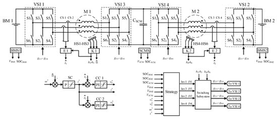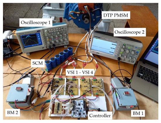 The following investigated configuration is promising for EVs—inverter-fed OEW BLDCM, shown in Figure 1, which combines one BM and one SCM, which through their inverters VSI 1 and VSI 2 are connected to the open ends of the motor armature winding []. With the help of different switching options of the inverter switches in different EV operating modes, the motor armature winding can be connected either to the BM or to the SCM at low EV speeds, or to two modules at the same time with the summation of their voltages at high EV speeds. During the regenerative braking of the drive, it is also possible to transfer the braking energy to the required power module. As a result of the research, inverter control algorithms were developed to ensure all modes of operation of the EV drive, as well as EMS to equalize the module charges.