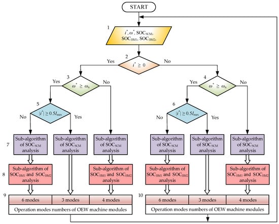The proposed modular EV powertrain system with hybrid electric power supply has the ability to work in a number of modes that differ among themselves in the number of operated armature-winding modules and their electric power supply. The block diagram of the general algorithm for controlling the DTP BLDCM operating modes and EMS is shown in Figure 5. The general algorithm divides the calculation path according to the following characteristics: the EV operating mode—traction or braking (block 2), the BLDCM speed control range—I or II zones (blocks 3 and 4), the drive load—small or large (blocks 5 and 6). For each of the six combinations formed depending on these features, the Sub-algorithm of SOCSCM analysis (blocks 7) and Sub-algorithm of SOCBM1 and SOCBM2 analysis (blocks 8) are then sequentially performed. Based on the results of this analysis, one of the EV modular powertrain operating modes is selected, which are included in the Operation modes numbers of OEW machine modules (blocks 9 and 10).