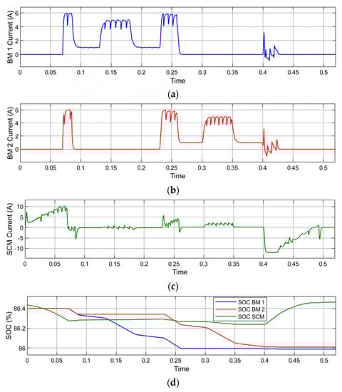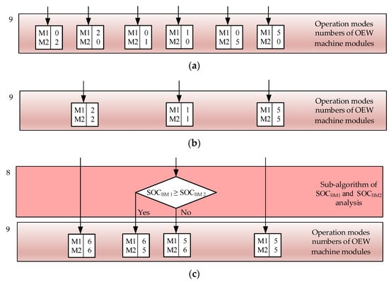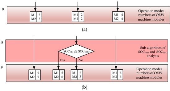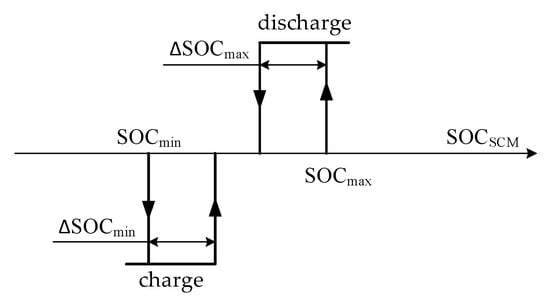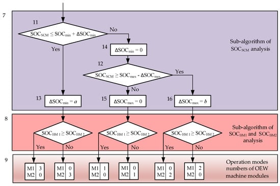 Figure 6 shows in full a fragment of the block diagram of the general control algorithm and SEM for one of the six cases (the first from the left in Figure 5) for the following features: EV traction mode, low speed DTP BLDCM (I zone) and light drive load. Blocks 11 and 12 in the Sub-algorithm of SOCSCM analysis determine in which zone the current value of SOCSCM falls in relation to the set values of the desired range from SOCmin to SOCmax, which is shown in Figure 7. After decreasing the SOCSCM below SOCmin or increasing the SOCSCM above SOCmax, another modular powertrain operation strategy is selected, aimed at charging and discharging the SCM, respectively. Further output from these modes occurs according to the hysteresis principle with the given values of the hysteresis bands ΔSOCmin and ΔSOCmax, respectively. These hysteresis bands are chosen from the condition of excluding frequent switching between modes. If you take SOCmax − SOCmin = 10%, then it is enough to take ΔSOCmin and ΔSOCmax at a level of 4–5%. In the algorithm, the blocks 13–15 perform a hysteresis function. Depending on the ratio of the current values of SOCBM1 and SOCBM2 (block 8), the following operating modes of OEW machine modules are selected from Table 4, which simultaneously provide the required operating mode of the drive and the SCM charging from the BM with a higher SOC or discharging to the BM with a lower SOC.