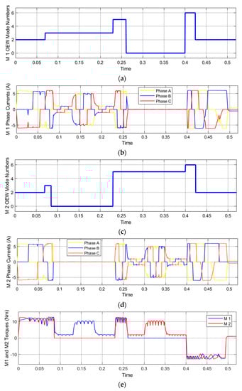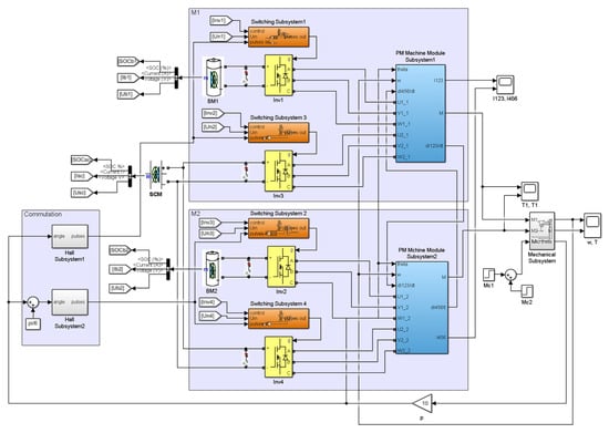 Figure 10 shows the main fragment of the computer model of the proposed H–H powertrain configuration, which includes two modules M 1 and M 2. Each module includes an OEW PM electromagnetic module, a power supply module BM and two VSIs. The SCM is a common power source for both modules. DTP PM electromagnetic modules are shown in detail in []. Each VSI is controlled by its Switching Subsystem, which receives 120-degree switching “pulses” signals formed by two Hall Subsystems based on information about the angular position of the rotor “theta”, which is received from the Mechanical Subsystem. Taking into account the asymmetric configuration of the two armature-winding modules, the switching of VSI 2 and VSI 4 is offset by an angle of π/6 in relation to VSI 1 and VSI 3, which ensures the operation of the switches of both groups of inverters in accordance with Table 1 and Table 2. Each Switching Subsystem also receives control signals from the Strategy Subsystem (not shown in Figure 10). The latter has a form of the MATLAB Function block, in which the operating mode control algorithm developed in Section 3.3 and is implemented as a program written in the C language. DTP BLDC drive works in a closed two-loop control system with the outer loop of the angular velocity control with a proportional speed controller SC (kP = 25) and the inner loops of the current control for each machine module by PI current controllers CC 1 and CC 2 (kP = 10, kI = 500). For making the current control loop, in this system, the estimated current values of each winding set were obtained by the Current Estimators. Electromagnetic torques generated by two machine modules are added in the Mechanical Subsystem common to the drive.