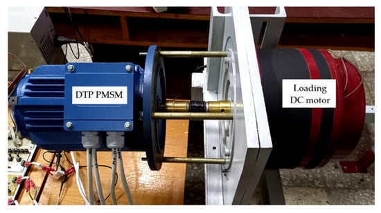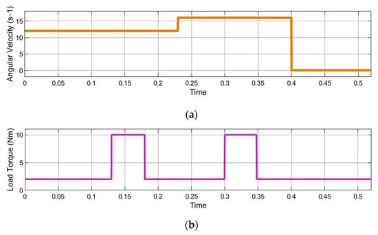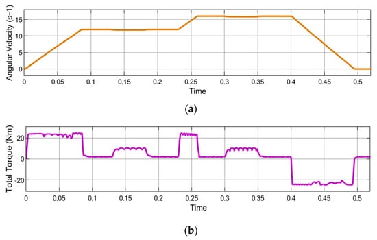 In this work, simulation studies were carried out with DTP PM machine, the detailed circular mathematical model of which is presented in []. This model is developed based on the results of numerical 2D FEM simulation of the magnetic field of a real external rotor machine. According to the developed method, the dependences of self-inductances and mutual inductances on the angle of rotation of the rotor was determined for various variants of module loads, in particular, both mutual inductances between phase windings in one machine module and all mutual inductances between phase windings of different machine modules. Based on the obtained results, a mathematical model of DTP BLDCM in phase coordinates was built, which allows you first to find the corresponding components of the armature currents by integrating six differential equations, and then calculate the current value of the electromagnetic torque based on the obtained current values. The full dynamic model of the studied electric machine is implemented in the Matlab/Simulink environment (MathWorks, Inc., Natick, MA, USA). The computer model created at the accepted assumptions has a relatively higher level of adequacy, which is confirmed by the corresponding waveforms taken experimentally on a mock-up sample of the electric drive system []. At the same time, this computer model demonstrated high performance for simulation on a personal computer. The main parameters of the studied DTP BLDCM, built based on the specified circular model, are presented in Table 8.