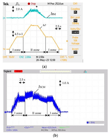 In the operating modes 1 and 2 of machine modules, one-way power supply of the winding set takes place from the BM or SCM side, respectively. At the same time, the maximum values of the phase voltages of the modular-armature winding and, accordingly, the angular velocity of the BLDCM are limited by the corresponding voltage levels of the BM or SCM. BLDCM speed regulation in these modes, which is carried out using the PWM of the VSI, is possible in the range from zero to the nominal value ωn, which corresponds to the one-way power supply of the armature-winding module (in Table 4, such a speed regulation range is indicated as I zone).