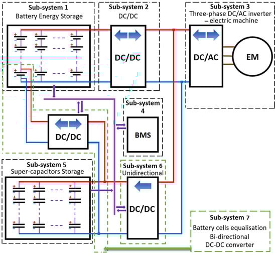 - Sub-system 1: battery ES comprises cells connected in series strings that are then paralleled. In the models and design procedures that were further developed, only a cell is used as an element of charge equalisation.