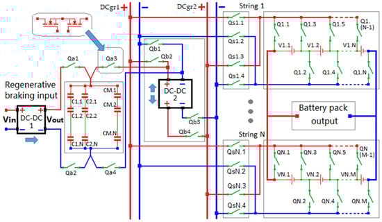 The connection between the DC–DC converters, SCES tank, and the battery is shown in Figure 2. The structure is based on bi-directional MOSFET switches, the combination of each ensures a flexible system with connections between the SC tank and each battery cell through the converter DC–DC 2 (sub-system 7, Figure 1). Each battery string is connected to two DC Grids (DCgr1 and DCgr2) with two switches on the positive and negative side, which requires four input switches per each string (Qs1.1–Qs1.4, String 1). Two switches connect each battery cell to the positive and negative sides. The bi-directional energy transfer charging or discharging the battery cell is transferred respectively from or to the SCES. Energy cell-to-cell equalisation is possible between every two different strings, connecting DC–DC 2 between DCgr1 and DCgr2 with switches Qb1–Qb4. The same operation mode is unsupported between two cells in the same string. This mode must be achieved through the SCs, connecting the DC–DC 2 with the SC tank with two switches, Qa3 and Qa4. The SCs charging is given from DC–DC 1 (sub-system 6, Figure 1), taking energy from the regenerative braking (sub-system 3, Figure 1). This converter is connected to the SC tank with unidirectional switches Qa1, Qa2.