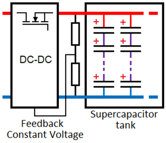 The control of the charging and discharging of the SCES applied with DC–DC converters must be conducted with precise control. An analysis of the control process is given in [41,42] focused on SCs aeronautical applications. As suggested, a buck–boost transformer-less converter can be successfully applied to control the energy storage charge. The main mathematical apparatus supporting the converter control system is presented, giving a stable operation for the entire voltage and energy range.