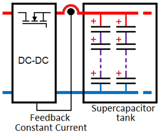 Block diagrams of a SCES charging with a DC/DC converter—constant current. Red—positive DC; Blue—negative DC.