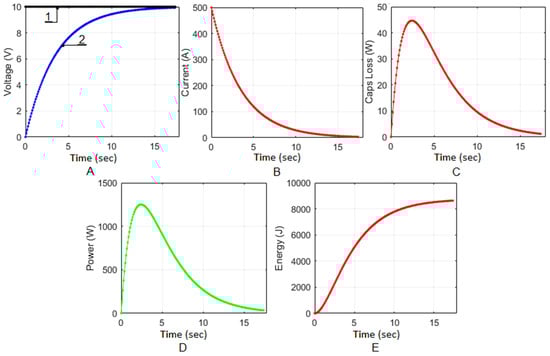SC tank charging with CV. (A) Constant charging voltage (1 Black), and capacitor’s tank voltage (2 Blue); (B) charging current (Red); (C) capacitor’s power loss (Red); (D) input source power (Green); (E) accumulated energy (Red).