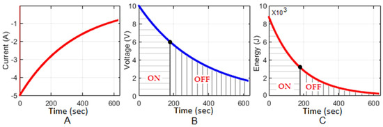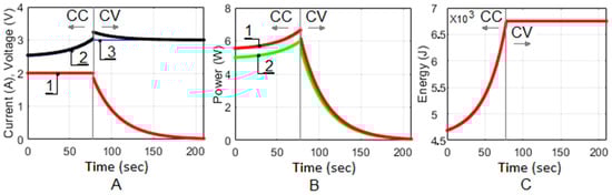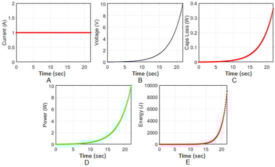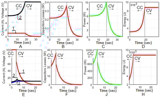 Figure 5 shows the results for CV charging as follows: (A) the transient charging process continues for , e.g., five times the time constant with constant input voltage ; (B) the peak current at the beginning of the transient process is , and the average current is , which are considered unacceptable for the selected battery cells; (C) the peak capacitor loss is and the average capacitor loss is ; (D) the peak power delivered to the energy storage is , and the average power is ; (E) the peak energy is , and the average accumulated energy is .
