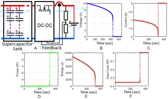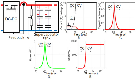 The results from the CV and CC simulations in Figure 5 and Figure 6 show that CV SCs charge applies high energy stress over the charging power supply and the capacitors, caused by a high initial current and leading to a high capacitor loss. The CC charging mode shows superior energy parameters, giving lower capacitor loss and potentially lower stress over the charging DC–DC converter. As given in Figure 6, the energy transfer process and cell charge equalisation cannot be completed only in the CC operation. Therefore, CC/CV charging can be recommended in order to use the maximum energy storage capacity [29]. The results are depicted in Figure 7: (A) A block diagram showing the necessary current and voltage feedback, giving the CC/CV mode of operation; (B) the constant current of 1 A and the voltage reaching the constant voltage of 10 V; (C) peak and average capacitor loss, respectively, of and ; (D) the maximum power reaches with an average power of ; (E) the average accumulated energy is .