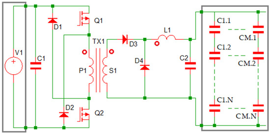 The converter is shown in Figure 9, where C1 is the input filter capacitor, Q1 and Q2 are primary side MOSFET switches, D1 and D2 are primary side demagnetisation diodes, TX1 is the high-frequency pulse transformer, diodes D3 and D4 form the secondary side rectifier and freewheeling diode, and the output filter is formed from the inductor L2 and capacitor C2. Following the suggested system architecture (Figure 1), the voltage source V1 represents sub-system 3, supplying the regenerative break energy, and the secondary side load is sub-system 5, e.g., the SCES under charge.