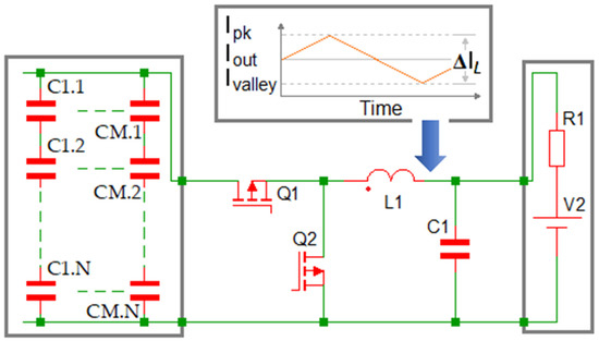 The SCES design mainly focuses on estimating the stored energy necessary for the battery cell charging and the capacitors’ power loss estimation. This requires an analysis of the selected converter architecture, focused on the specific CC/CV charging modes of operation. The design procedure must define the necessary number of capacitors in series, strings in parallel (sub-system 4, Figure 1), and the total capacitance. The required energy for the battery cell charge is estimated as the constant power delivered over time, which must be delivered from the SC tank with no external source available. The energy stored in the SCES must be more than what is required for the charging process to be completed, compensating for the residual energy after each cycle. The precise amount, respectively, the integrated tank capacity and structure, is to be estimated analytically and depicted using simulation procedures. Considering the non-isolated bi-directional DC–DC converter, the maximum SCES voltage could be recommended in a range between 2 and 2.5 times the battery cells’ voltage. A value of 10 V is accepted, based on the nominal 3.7 V Li-ion battery cells voltage. The relatively small voltage difference allows a transformer-less bi-directional buck–boot DC–DC converter to be utilised, giving a simple structure and high efficiency.