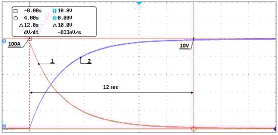 Figure 15 shows the SCES charging current and voltage from the DC–DC 1 converter (Figure 2). Probe 1 shows the current with the initial value of 100 A, and probe 2 shows the SCES voltage charge between 0 V and 10 V. The experiment supports the CV operation of charge. The experiment supports the simulations shown in Figure 5. The current is limited according to the converter parameters. The process continues for 12 s, simulating a charge from the regenerative brake of an electric vehicle. As shown, the peak current could be supported by the designed DC–DC converter, but the installed resource will not be fully used. Hence, the charging time exceeds the expected regenerative brake time, compromising the system’s efficiency.