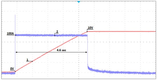 Figure 16 shows the SCES charging with CC operation. The experiment supports the simulation results shown in Figure 6. The constant current is fixed at 100 A, which continues for 4.6 s. For this time, the voltage rises from 0 to the maximum of 10 V, after which the system operates with CV. The installed converter’s maximum power is better used, and the charging time complies with the expected regenerative brake time.