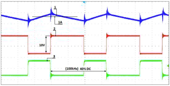 Figure 17 shows the DC–DC 2 converter (Figure 2) in the buck mode of operation during a battery cell equalisation. Probe 1 is the current over the inductor L1, probe 2 is the voltage over the MOSFET Q1 (Figure 10), and probe 3 is the PWM signal to the Q1 gate. The voltage peaks over the transistor’s drain-to-source are acceptable but could be limited with snubber capacitors. The calculated inductor of is selected with a saturation current of 2 A, i.e., double the nominal current. This inductor could be further increased in order for the current ripples to be reduced.