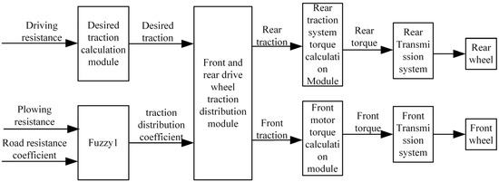 In Figure 3, the AVL-CRUISE software inputs the driving resistance and outputs the desired tractive force through the desired tractive force calculation module. The plowing resistance and road resistance coefficient are used as input variables of fuzzy controller 1, and the output variable tractive force distribution coefficient k is obtained by fuzzification, fuzzy inference and anti-fuzzification of fuzzy controller 1, and then the k value is transmitted to the front- and rear-drive wheel tractive force distribution module. The front- and rear-drive wheel tractive force distribution module distributes the tractive force of the front-drive wheel and the rear-drive wheel through the demand tractive force and the tractive force distribution coefficient. The front-drive wheel tractive force and rear-drive wheel tractive force are calculated to obtain the front-drive system torque and rear-drive system torque, which are transmitted to the front-drive wheels and rear-drive wheels through the transmission system. In Figure 4, the torque distribution control strategy based on fixed ratio distribution is the same as the strategy proposed in this paper except that the tractive force distribution coefficient is different from the strategy proposed in this paper.