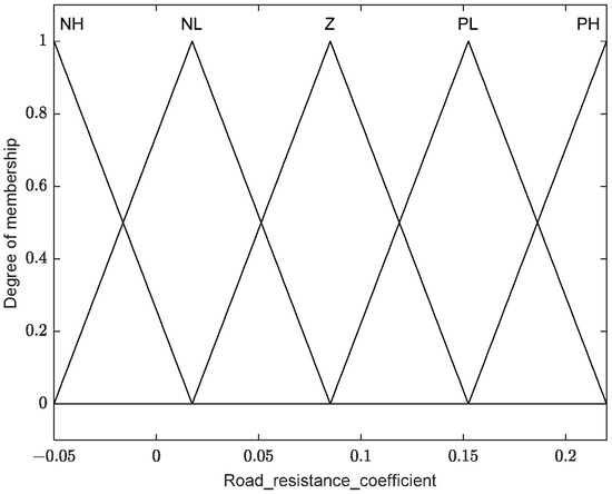 And, respectively, stipulate the following fuzzy subsets: the fuzzy subset of proportional values of plowing resistance is E() = {NB,NM,Z,PM,PB}. The fuzzy subset of road resistance coefficient is E() = {NH,NL,Z,PL,PH}. The fuzzy subset of the tractive force distribution coefficient is E() = {ND,NB,NM,NS,Z,PS,PM,PB,PD}. The fuzzy subsets {NH,NL,Z,PL,PH} represent negative high, negative low, medium, positive low, and positive high, respectively. The fuzzy subsets {ND,NB,NM,NS,Z,PS,PM,PB,PD} represent negative pole, negative large, negative medium, negative small, medium, positive small, positive medium, positive large, and positive pole, respectively.