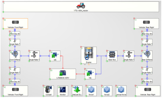 In this paper, AVL-CRUISE software is used to establish a vehicle model of a Hybrid four-wheel drive tractor [26,27,28], the main technical parameters of the Hybrid four-wheel drive tractor are shown in Table 3, and MATLAB/Simulink software is used to build a torque distribution control strategy based on fuzzy control, and the joint simulation analysis of AVL-CRUISE and MATLAB/Simulink is carried out.