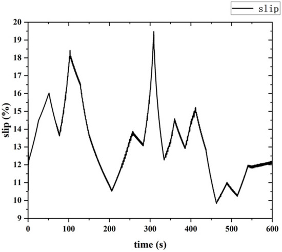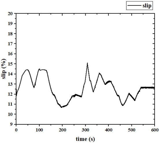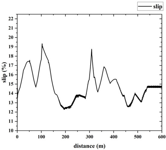 From Formulas (2)–(4), the tractor in the plowing operation, plowing resistance, gradient resistance, and rolling resistance are important factors affecting the drive wheel slip rotation, air resistance and acceleration resistance value is small, neglected. Therefore, the concept of road resistance coefficient is introduced, the road resistance coefficient is the sum of the gradient and rolling resistance coefficient, and it can reflect the road resistance situation. The tractor’s drive wheel slip rate is controlled at about 10~15%, and the tractor has the highest traction efficiency.