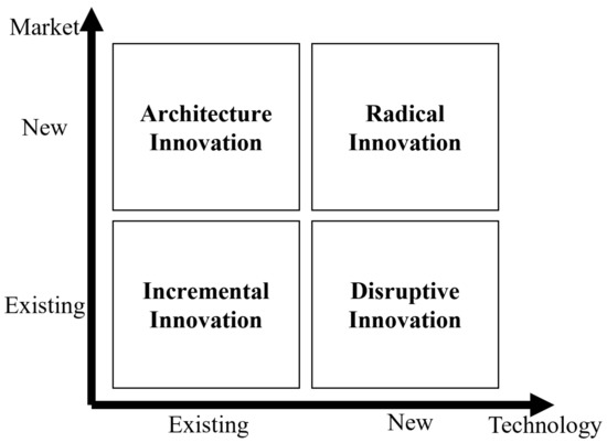 Architecture Innovation: Applicable to existing technologies and new markets. According to the market and strategy, ideas are combined with existing technologies, and concepts are transformed into products. Then, they are developed, produced, and put on the market. The enterprise’s market strategy is made to conform to the existing market changes [49,50,51]. The use of architectural innovation depends on the number of patents or the number of self-owned innovative technologies, for example, GU [52] for Tesla Motors.