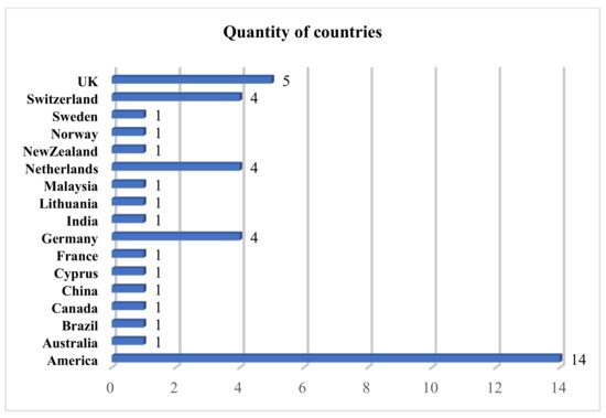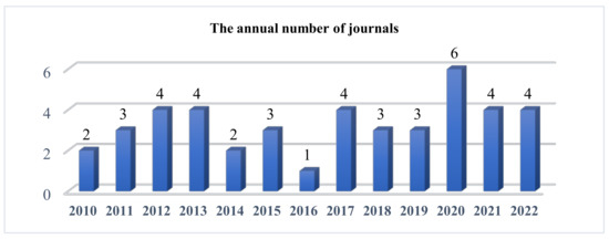 According to the content attributes of the selected 43 periodical documents, this research fills in the innovation matrix (multiple selections are allowed) and makes an electric vehicle innovation matrix document arrangement, as shown in Appendix A; then, according to Appendix A, the year number of periodicals is sorted out, as shown in Table 3 and Figure 2; additionally, depending on the document type, organized into a table of the number of periodicals by category, as shown in Table 4; according to the content of the review, the number of years, and the number of countries in which the periodicals are published, it is organized into Table 5 and Figure 3.