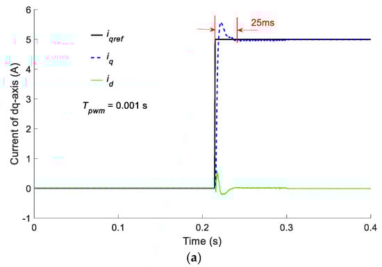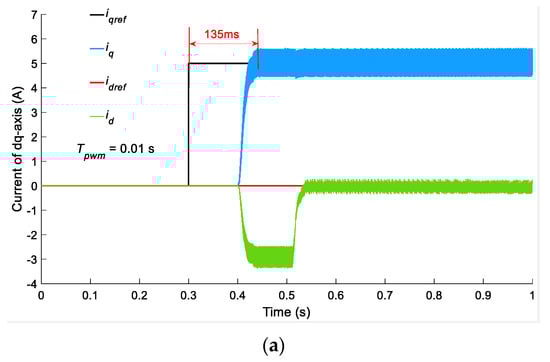 In Figure 6, Figure 7 and Figure 8, the step pulse amplitude of the q-axis target current is , and the d-axis target current is . From Figure 6, Figure 7 and Figure 8, it can be concluded that with the IMC-PI method, the switching cycle of the inverter almost has no impact on the dq-axis current reaction time of IPMSM (, , and , respectively). However, when the switching cycle of the inverter varies from 0.001 s to 0.1 s, the dq-axis current reaction time of IPMSM is decreased by the PI method. For example, based on the PI method and switching cycle , the delay time of the dq-axis current reaction time of IPMSM is approximately 0.1 s, as shown in Figure 7a. What is more important is that when the switching cycle is , the delay time of the dq-axis current reaction time of IPMSM is increased to 1 s (see Figure 8a).