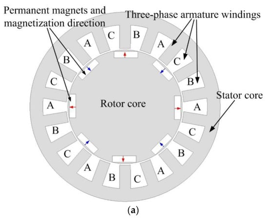 where the subscript symbols and are the d-axis and q-axis, respectively, and are the voltages, and are the currents, and are the inductances, and are the flux linkages, is the resistance of stator phase winding, and is the electric angular velocity of rotor of IPMSM [25,26,27]. In addition, the d-axis flux linkage and q-axis flux linkage can be written as