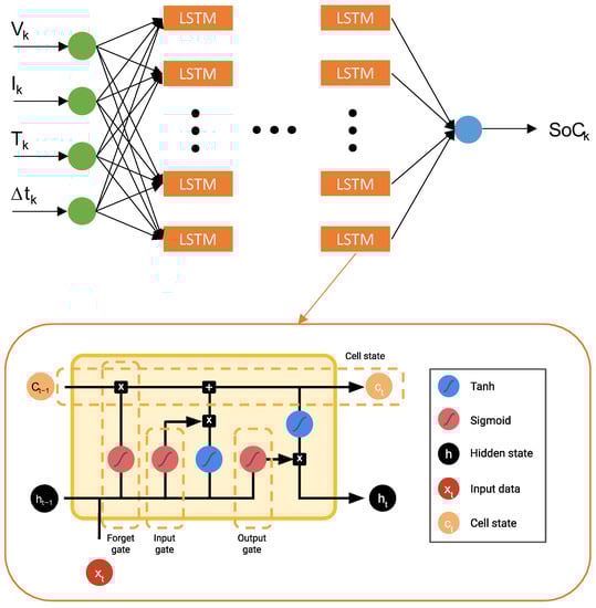 The algorithms called recurrent neural networks (RNN) show high robustness to dynamic loads, nonlinear dynamic nature, hysteresis, aging, and parametric uncertainties [18]. While making use of historical information, the RNN presents a better estimation of the battery SoC when compared to other neural networks [19]. But RNNs are unable to describe long-term dependencies because they suffer from a vanishing gradient effect, which causes neural networks to have a short-term rather than a long-term memory [14]. To overcome this problem, another type of unit called long short-term memory (LSTM) is used by using a memory cell. An LSTM decides what to remember and what to forget, using different gates (input, output, and forget) [20].