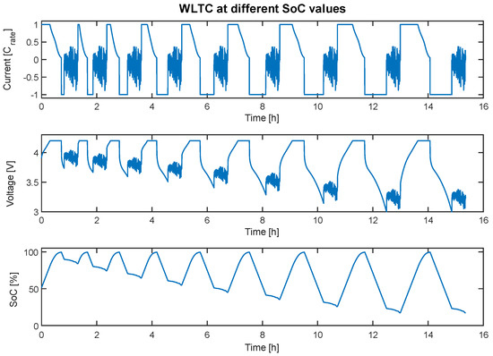 Finally, the battery was simulated under standardised driving cycles. The battery was charged up to 100% SoC, and then standard driving profiles were simulated. Once the profile was completed, the battery was charged at a constant current up to 100% SoC and discharged at a constant current 5% SoC, and the same profile was simulated again. The same process was repeated, discharging after each charge 5% more SoC than the previous time until the lower voltage limit of the battery was reached. This same test was repeated for each of the six simulated driving cycles (NEDC, WLTC, US06, HWFET, NYCC, and UDDS) and at four different temperatures (0 °C, 10 °C, 25 °C, and 45 °C). In Figure 3, the cycle is depicted that corresponds to the WLTC driving cycle at 25 °C, starting at a different SoC each time.