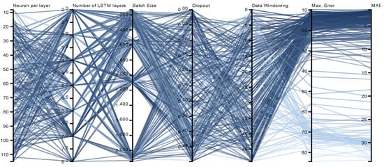 Figure 4 shows the results obtained after performing the Bayesian optimisation. During the optimisation, the different hyperparameters listed throughout this Section 4 have been tested. For example, as depicted in Figure 4, various network sizes were tested, ranging from a single LSTM layer to eight LSTM layers and from eight neurons per layer to 120 neurons per layer. The results indicate that the optimal configuration, which yielded the best outcomes, consists of three LSTM layers with 50 neurons per layer.