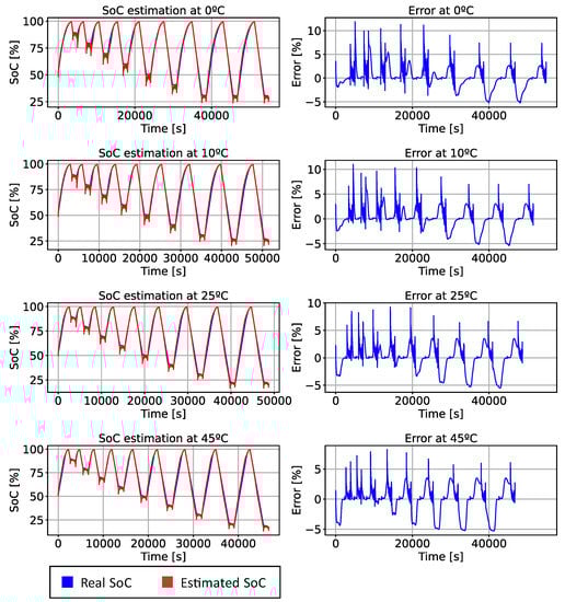 As mentioned in Section 4, the data corresponding to the EV profiles have been used to test the algorithm. Figure 6 shows how the algorithm behaves and the error it yields for the WLTP profile at 0 °C, 10 °C, 25 °C, and 45 °C.