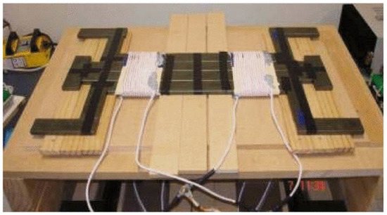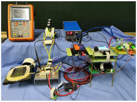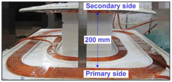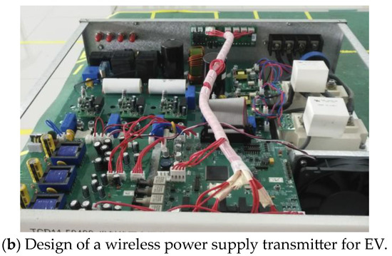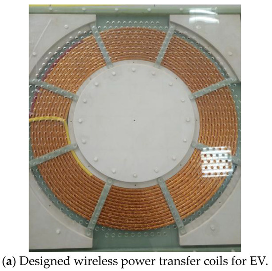 The experimental platform is shown in Figure 13. The mutual inductance calculation method can be performed by measuring two coils in series and subtracting two self-inductances [13]. The experimental data and results are shown in Table 4. Table 3 lists the mutual inductance and coupling coefficients of the three types of couplers at three different pitches for the transmitter and receiver coils. Figure 14 shows the verification system for this experiment. Figure 15 shows the wireless power supply system and coil that we developed for the electric vehicle.