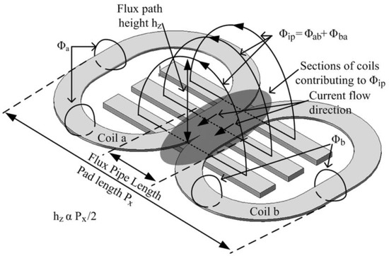 Researchers have already investigated circular pad couplers and found that the basic magnetic flux path within the pad remains relatively fixed [8]. Therefore, to enhance the coupling efficiency of coils, further research is needed into other coil structures and design methods. In 2010, the University of Auckland proposed a coil design called “Flux Pipe” based on their research on the magnetic field characteristics of circular coil pads, as shown in Figure 1. This design utilizes a dual-coil structure where two coils are connected in parallel, and the magnetic flux generated by the two coils is connected in series within the magnetic circuit. As a result, the design enhances the horizontal displacement tolerance [9]. In 2012, Saitama University in Japan introduced a transformer design called the “H-coil”. This coil design is compact and tightly arranged, resulting in a smaller size, as shown in Figure 2. Additionally, the magnetic field of the coil is located on both sides of the coil, providing strong resistance against displacement [9,10].