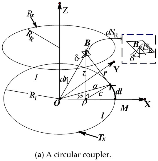 where are the coordinate component of B. a, z, and ρ are the length of the line in Figure 9a. In Figure 9a, Rx is the receiving coil, RR is the radius of Rx, and the rest of the symbols are lengths or angles.