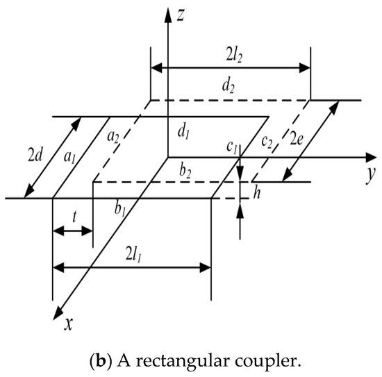 For the two most common types of circular and square coils, the structure is axisymmetric. For each of the above two types of coils as the transmitting coil, the case of magnetic field coupling using two types of single-turn coils as the receiving coil is considered, as shown in Figure 9. First, the calculation models of the magnetic induction intensity of two kinds of coils were established, numerical calculations were carried out via MATLAB R2020b, and then the electromagnetic coupling characteristics of the two coils as receiving coils under three different conditions were qualitatively analyzed. Secondly, the simulation analysis of three kinds of couplers, a coupler with two circular loops (circular coupler), a coupler with one circular and one square loop (hybrid coupler), and a coupler with two square loops (square coupler), were carried out in Ansoft Maxwell 16.0 electromagnetic simulation software. Finally, the analysis was verified experimentally, and the characteristics of the two types of coils and the occasions for adjustment were obtained. The significance of this paper is that it establishes a reference for basic structural options that can be integrated into the selection and design of coil structures.