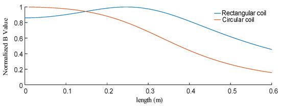 For the transmitting coils with a given surrounding area of 0.28 m2, according to (2) and (8), the normalized curve of the magnetic flux density can be obtained when the circular and square coils are used as the transmitting coils, respectively, as shown in Figure 10. In Figure 10, the horizontal axis is the horizontal distance from any point of constant height to the central axis of the transmitter coil. The height of the measuring point is 0.25 m from the coils. It can be seen from Figure 10 that the B value is higher inside the coils and gradually decreases outside the coils.